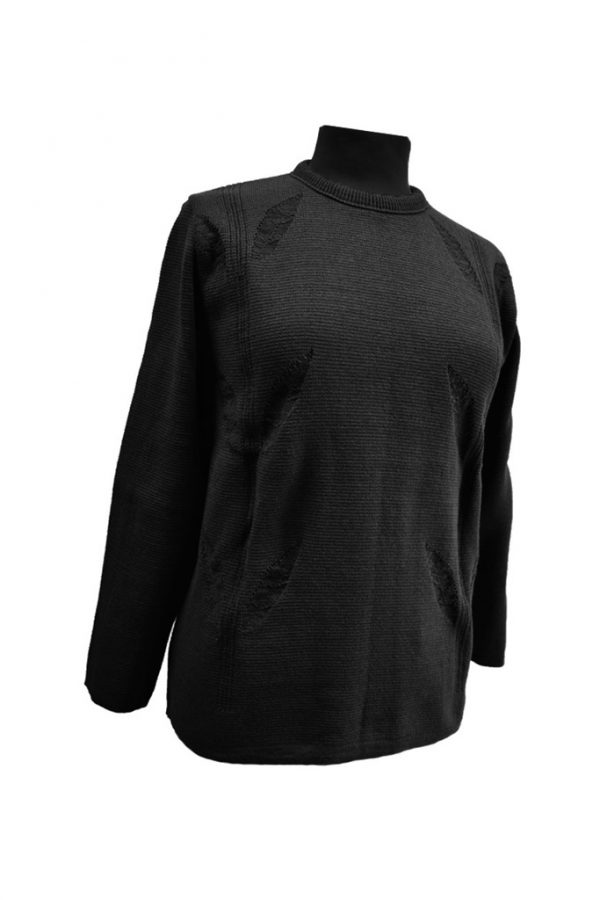Κλασική πλεκτή μπλούζα σε χρώμα μπλε σκούρο, με κλειστό λαιμό και διακριτικά πλεκτά σχέδια σε σχήμα φύλλου στο μπροστινό μέρος. Πολύ καλή ποιότητα και εφαρμογή. Σύνθεση 100% ακρυλικό, εληνικής εταιρείας FOX.