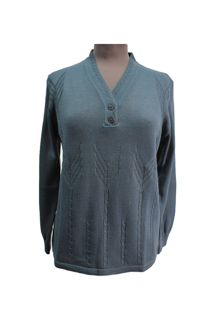 Κλασική πλεκτή μπλούζα σε χρώμα ραφ, σε V με δύο κουμπιά και πλεκτά σχέδια στο μπροστινό μέρος. Υπέροχη εφαρμογή και ποιότητα, ελληνικής εταιρείας Ευτυχία. Σύνθεση 100% ακρυλικό.