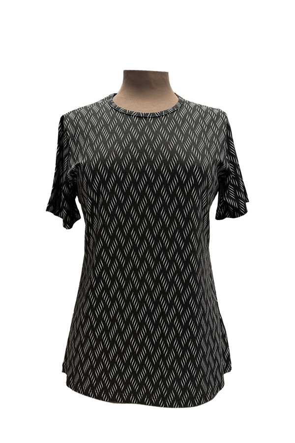 Μπλούζα γυναικεία βισκόζ με κοντό μανίκι σε απόχρωση μαύρο με λευκό. Δροσερή με υπέροχη εφαρμογή, ιδανική για καθημερινή χρήση. Σύνθεση 92% βισκόζη- 8% ελαστάνη.
