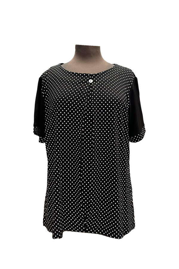Μπλούζα γυναικεία βισκόζη με κοντό μανίκι σε απόχρωση μαύρο με λευκό πουά. Ιδιαίτερο κόψιμο με λεπτομέρειες. Δροσερή με υπέροχη εφαρμογή, ιδανική για καθημερινή χρήση. Σύνθεση 92% βισκόζη- 8% ελαστάνη.