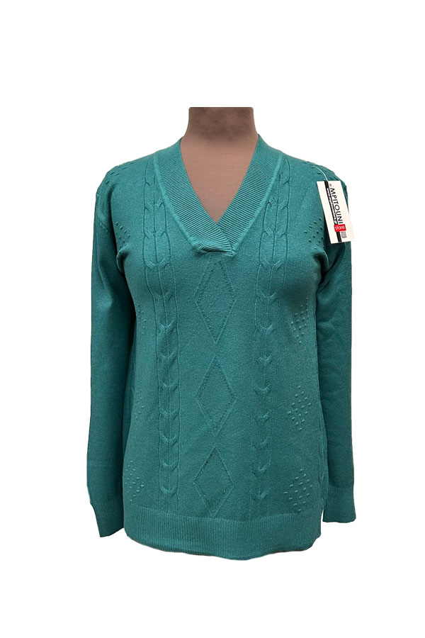 Πλεκτή μπλούζα γυναικεία σε κυπαρισσί χρώμα σε V. Ιδανική για καθημερινή χρήση, με μαλακή υφή. Σύνθεση 35% βισκόζ- 30% πολυαμίδιο- 25% μοντάλ- 10% ελαστάνη.