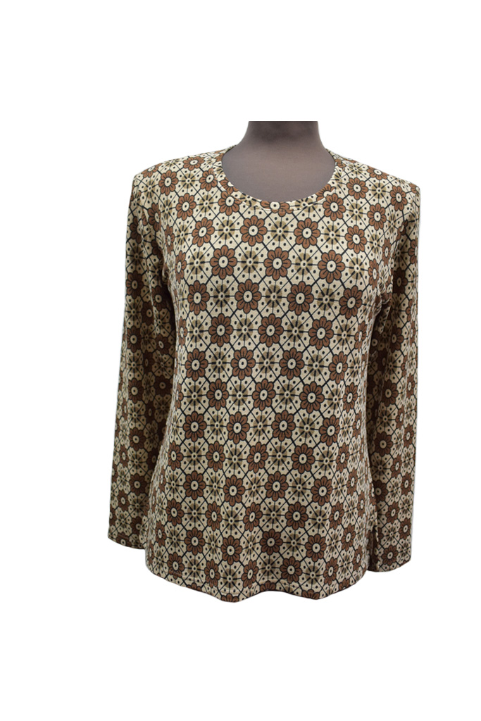 Γυναικεία μπλούζα σε πλεκτό πολυεστέρα, εμπριμέ σε αποχρώσεις μπεζ με καφέ. Ιδανική και για καλές εμφανίσεις, απίστευτη ποιότητα και εφαρμογή, ελληνικής εταιρείας Venturo. Σύνθεση 94% πολυεστέρας- 6% spandex.