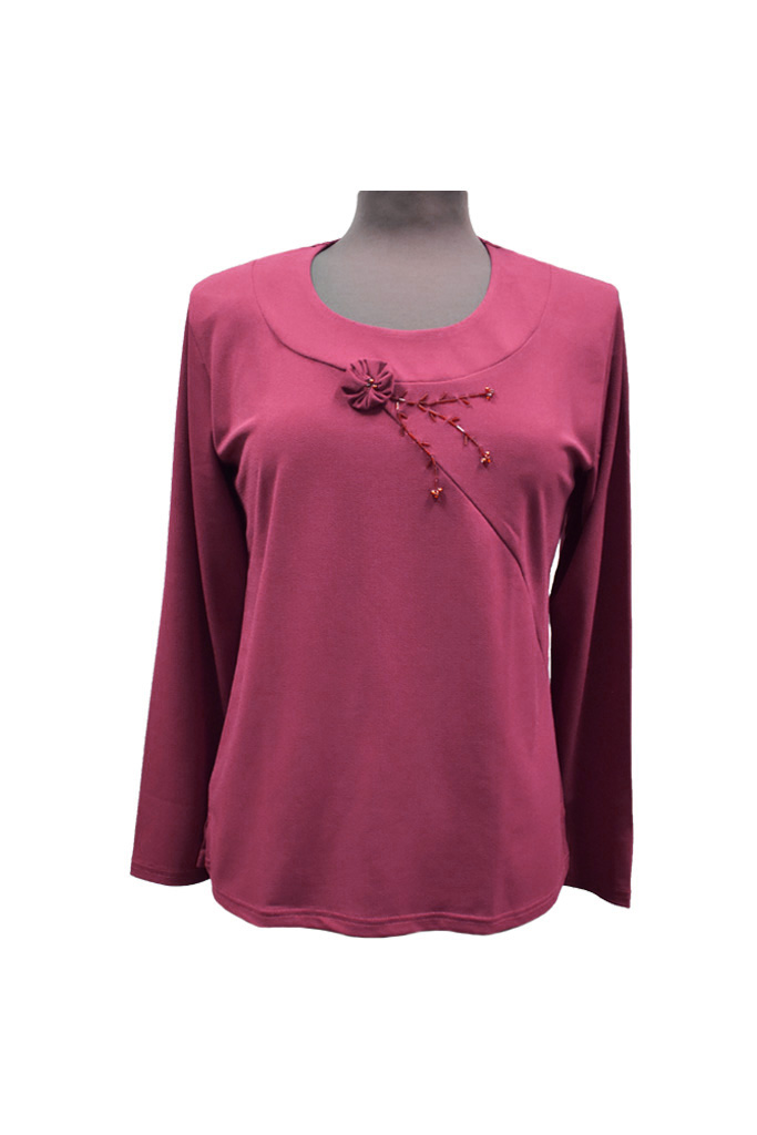 Γυναικεία μπλούζα ζέρσεϊ σε βυσσινί χρώμα με σχέδια στο μπροστινό μέρος. Άψογη εφαρμογή, υπέροχη ποιότητα. Ελληνικής εταιρείας Venturo. Σύνθεση 92% πολυεστέρας, 8% spandex.