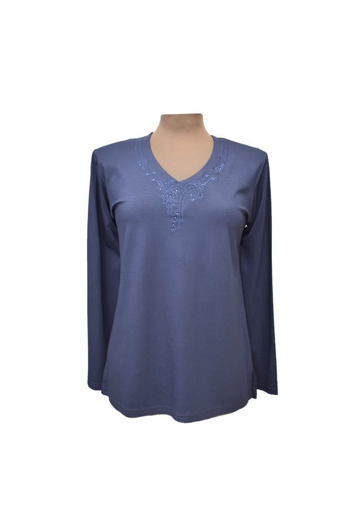 Γυναικεία μπλούζα σε μπλε χρώμα, σε V, με μακρύ μανίκι, σε ύφασμα βισκόζ, ελληνικής εταιρείας Venturo. Άριστης ποιότητας, με εξαιρετική εφαρμογή. Σύνθεση 95% βισκόζ, 5% ελαστάνη.