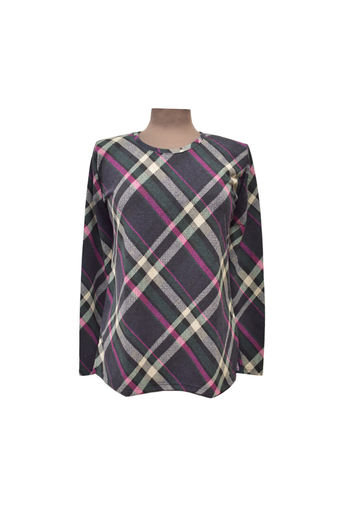 Γυναικεία μπλούζα με μακρύ μανίκι σε μαύρο χρώμα με καρό σχέδια με μπεζ και μωβ αποχρώσεις μπροστά και πίσω! Εντυπωσιάστε με μια μπλούζα σαν και αυτή! Εξαιρετικής ποιότητας και εφαρμογής, ελληνικής εταιρείας Venturo. Σύνθεση 80% πολυεστέρας- 16% ραγιόν- 4% σπάντεξ.