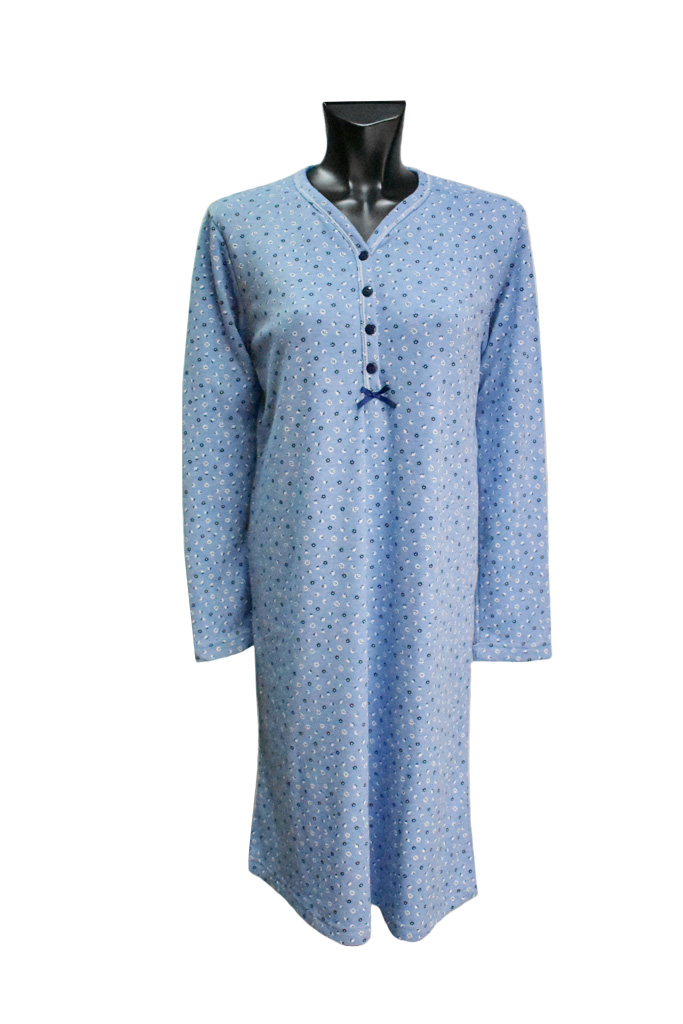 Νυχτικιά με μακρύ μανίκι με επένδυση σε γαλάζιο χρώμα με ανθάκια. Σύνθεση 95% βαμβάκι- 5% πολυεστέρας.