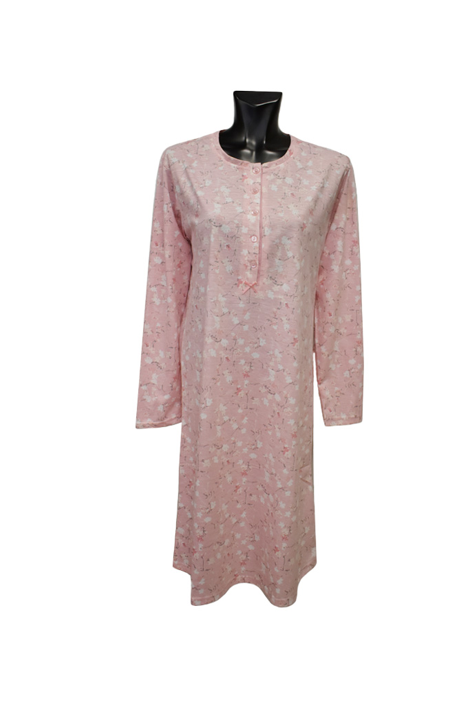 Νυχτικιά βαμβακερή με μακρύ μανίκι σε ροζ χρώμα με λευκά ανθάκια. Πολύ καλή ποιότητα και εφαρμογή. Ιδανική για άνοιξη- φθινόπωρο. Σύνθεση 95% βαμβάκι- 5% πολυεστέρα.