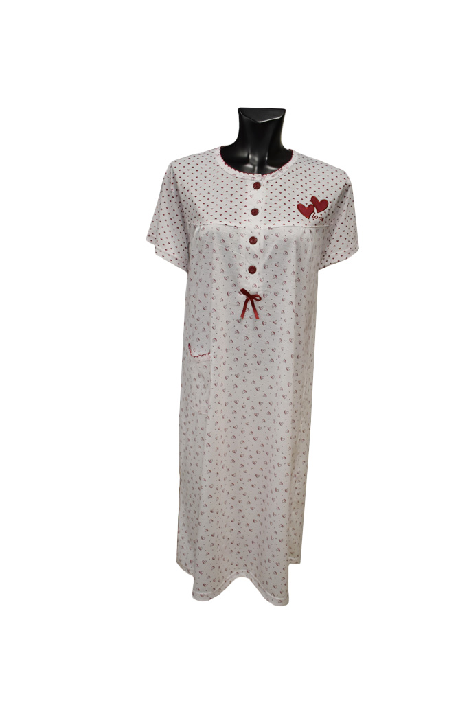 Νυχτικιά με κοντό μανίκι, βαμβακερή, σε χρώμα λευκό με μπορντό σχέδια. Σύνθεση 90% βαμβάκι- 10% πολυεστέρας.