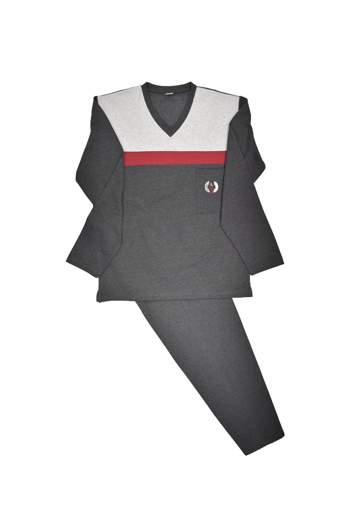 Αντρική πυτζάμα βαμβακερή με επένδυση , σε χρώμα γκρι σκούρο σχέδιο στο μπροστινό μέρος της μπλούζα. Mε μακρύ μανίκι και λαιμόκοψη σε V. Ελληνικής εταιρείας (LION), άριστης ποιότητας. Σύνθεση βαμβάκι 100%.