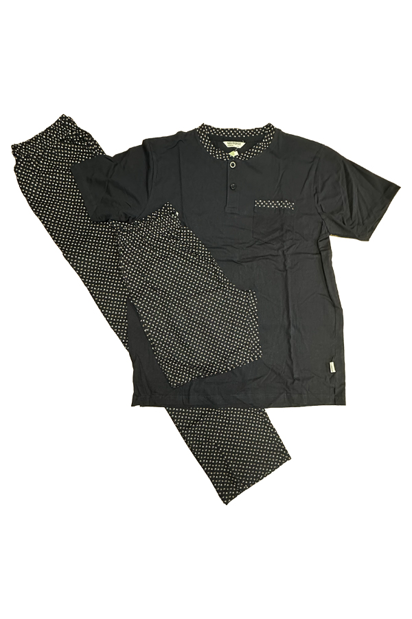 Πυτζάμα αντρική βαμβακερή σε μπλε χρώμα με μοτίβο. Αποτελείται από 3 τεμάχια, μπλούζα με κοντό μανίκι, σορτς και μακρύ παντελόνι. Ελληνικής εταιρείας. Σύνθεση 100% βαμβάκι.
