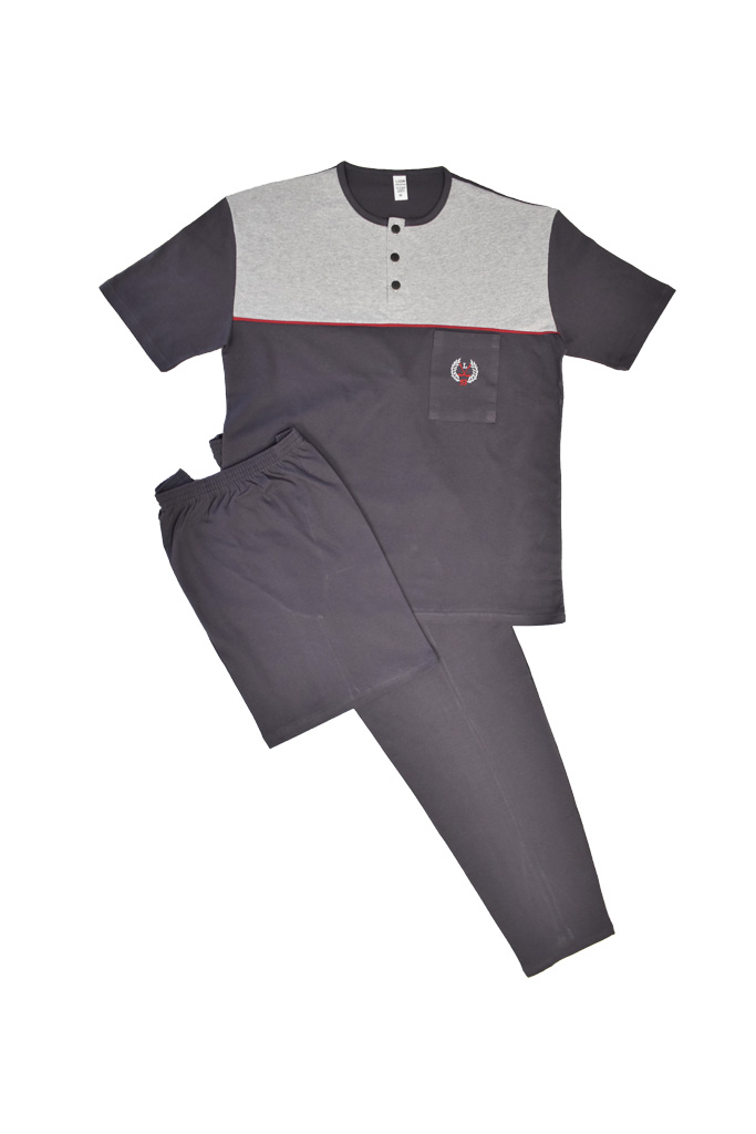 Πυτζάμα αντρική με 3 κομμάτια, μπλούζα με κοντό μανίκι και δύο παντελόνια μακρύ και κοντό σε χρώμα γκρι σκούρο με γκρι ανοιχτό. Ελληνικής εταιρείας Lion, άριστης ποιότητας, σύνθεση 100% βαμβάκι.