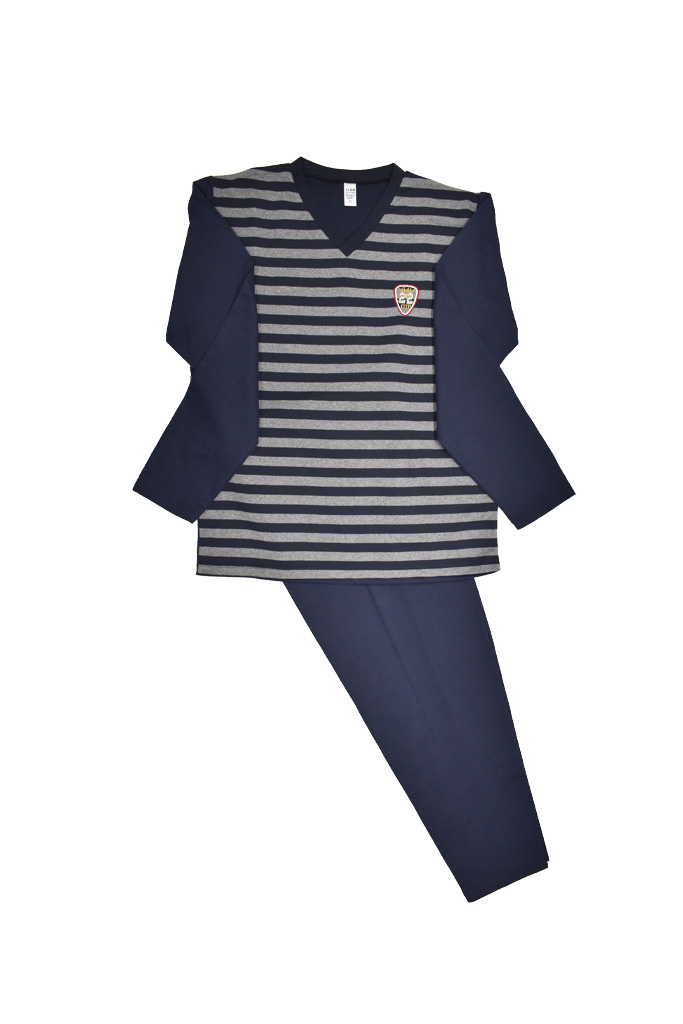 Αντρική πυτζάμα βαμβακερή 100%, σε χρώμα μπλε σκούρο με ρίγες σε γκρι σκούρο στο μπροστινό μέρος της μπλούζα. Mε μακρύ μανίκι και λαιμόκοψη σε V. Ελληνικής εταιρείας (LION), άριστης ποιότητας.