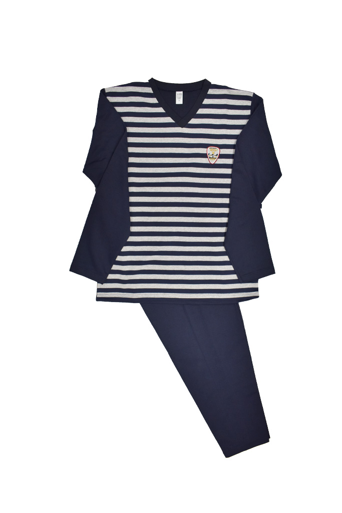 Αντρική πυτζάμα βαμβακερή 100%, σε χρώμα μπλε σκούρο με γκρι ρίγες στο μπροστινό μέρος της μπλούζα. Mε μακρύ μανίκι και λαιμόκοψη σε V. Ελληνικής εταιρείας (LION), άριστης ποιότητας.