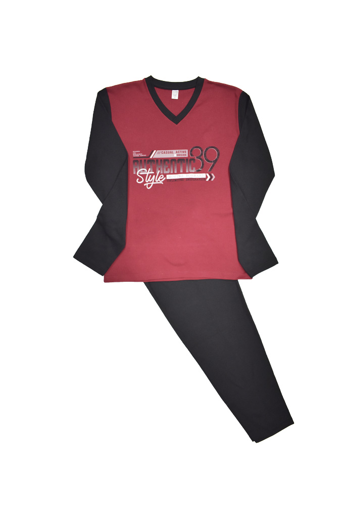 Αντρική πυτζάμα βαμβακερή 100%, σε V, σε μπορντό χρώμα, με σχέδια στο μπροστινό μέρος της μπλούζας και παντελόνι σε μαύρο χρώμα. Mε μακρύ μανίκι, ελληνικής εταιρείας (LION), άριστης ποιότητας.