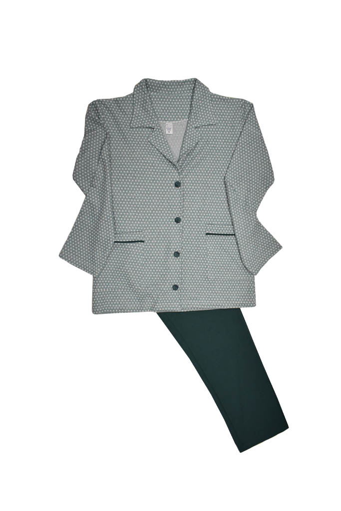 Γυναικεία πυτζάμα σε χρώμα πράσινο σε στυλ πουκάμισο το πάνω μέρος και παντελόνι με λάστιχο στη μέση. Ελληνικής εταιρείας Lion. Σύθεση 100% βαμβάκι.