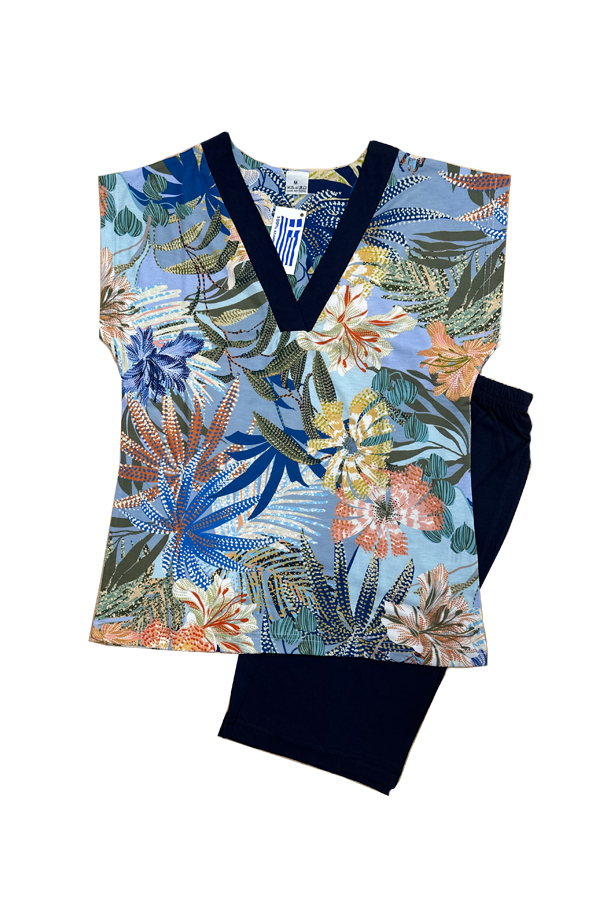 Γυναικεία πυτζάμα με παντελόνι σορτς έως το γόνατο και μπλούζα χωρίς μανίκι, εμπριμέ.  Σύνθεση 100% βαμβάκι interlok. Ελληνικής εταιρείας. Εξαιρετική ποιότητα και εφαρμογή.