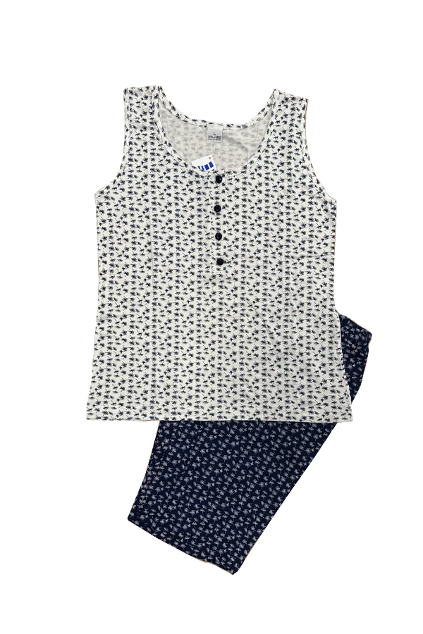 Γυναικεία πυτζάμα με παντελόνι σορτς έως το γόνατο και μπλούζα χωρίς μανίκι μανίκι σε απόχρωση μπλε και λευκό. Εξαιρετική ποιότητα και εφαρμογή.