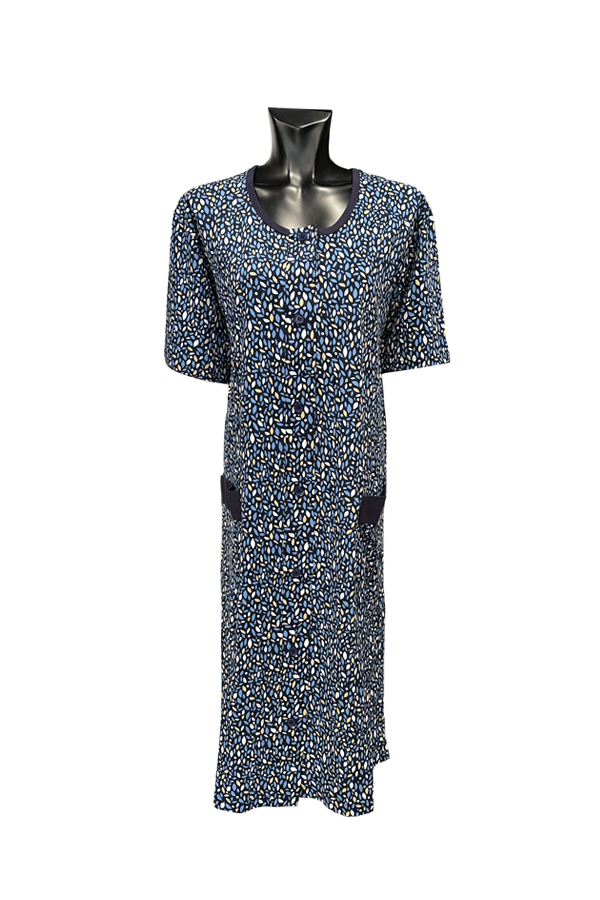 Κλασική ρόμπα με κοντό μανίκι και τσέπες σε μπλε απόχρωση με σχέδια, βαμβακερή 100%, ελληνικής εταιρείας (ΑΛΊΝΑ). Εξαιρετικής ποιότητας, ΔΕΝ φεγγίζει! Ιδανική για καθημερινή χρήση. Κομψή και άνετη.