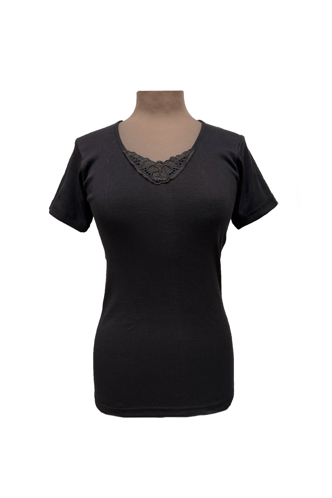 Μαύρο φανελάκι βαμβακερό 100% με κοντό μανίκι και δαντέλα, εταιρείας Lilis, χωρίς ραφή στο πλάι.