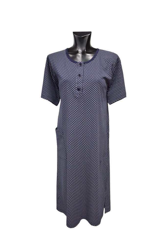 Κλασικό φόρεμα με κοντό μανίκι και τσέπη σε χρώμα μπλε με λευκό πουά, βαμβακερό 100%, ελληνικής εταιρείας (ΑΛΊΝΑ). Εξαιρετικής ποιότητας, ΔΕΝ φεγγίζει! Ιδανικό για καθημερινή χρήση. Κομψό και άνετο. Διαθέτει τρία κουμπιά και δύο διακριτικά ανοίγματα στα πλαϊνά (ένα σε κάθε μεριά) για άνετο περπάτημα.